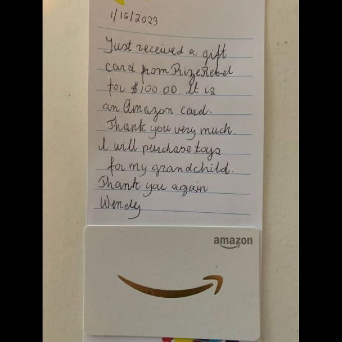 Thank you, PrizeRebel, for sending me an Amazon gift card for $100.00. I had a great time answering surveys and have been doing it for some years. They are very interesting and I've learned from them. Thank you Wendy Ewald