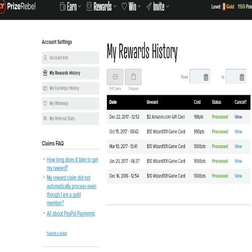 I, like most of you thought this website was one big scam. Boy, was I wrong. You can expect to get a gift card for every 6 surveys done, and even faster as you progress through the levels on your journey to platinum. Since I've started prizerebel I've received $75 and I'll be reaching $80 very shortly. This is a great website.