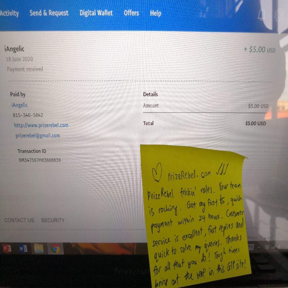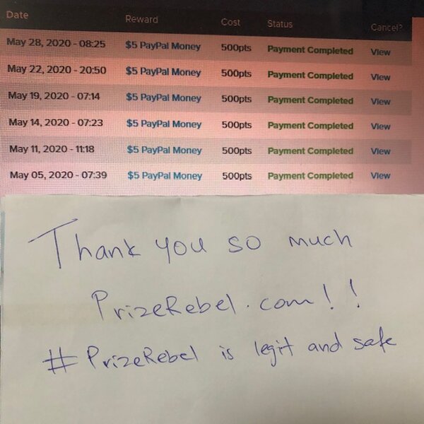 PrizeRebel.com has never failed to disappoint me. For instance, in May, I have received at least USD30. This reliable website has certainly given me an opportunity to earn side income that can be used to offset some of my expenses. Thank you PrizeRebel.com!!